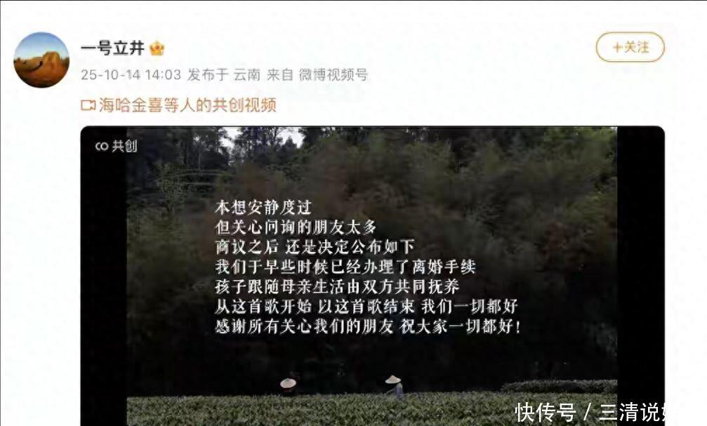 文艺中年最后的倔强回望鹏鹏前半生,他的感情路像一部加长版八点档:2003年,王菲牵着他走红毯,天后一句“他就是我男朋友”让媒体炸锅;2006年,两人婚姻走到尽头,鹏鹏写“我要的是一个家庭,你却注定是一个传奇”,把分开包装成成人礼;2014年,他与瞿颖、周迅的绯闻拉锯战再次刷屏;2020年,小他19岁的海哈金喜出现,雪山求婚、民族服饰、牵手转圈,全网都在感叹“中年大叔也能有童话”。如今童话续集戛然而止,只剩一句“我们早已办妥手续”,连吵架画面都没流出,比电视剧还冷静。有人说,鹏鹏把日子过成了行为艺术:经商失败——“小镇文化IP”成了烂尾园,欠下一屁股债;直播翻车——卖39块的情怀茶叶,被嘲“割韭菜”;感情再翻车——二婚依旧没能逃过“七年之痒”打折版。可他也确实在认真生活:疫情最严重时,他跑去郊区菜地亲手种有机番茄;女儿出生,他天天微博晒娃,连尿不湿品牌都研究得门儿清;限高不能坐飞机,他就高铁转大巴,一站站跑去谈合作,只为把债还清。浪漫与狼狈在他身上并存,像一台老旧的唱机,旋律依旧动人,只是时不时卡壳。所以,这场离婚到底是“体面分手”还是“技术性避险”?支持“体面派”认为:两人没互撕、没互泼脏水,堪称娱乐圈清流;支持“技术派”则列出明细:鹏鹏2023年新增3条被执行人信息,总金额超6000万,离婚协议把时间线提前,恰好避开新一轮资产冻结;中立派吃瓜:不管真离假离,只希望小朋友别被镜头追着跑,毕竟孩子才是最无辜的观众。哎,离都离了,二娘我祝愿他们各自安好吧!